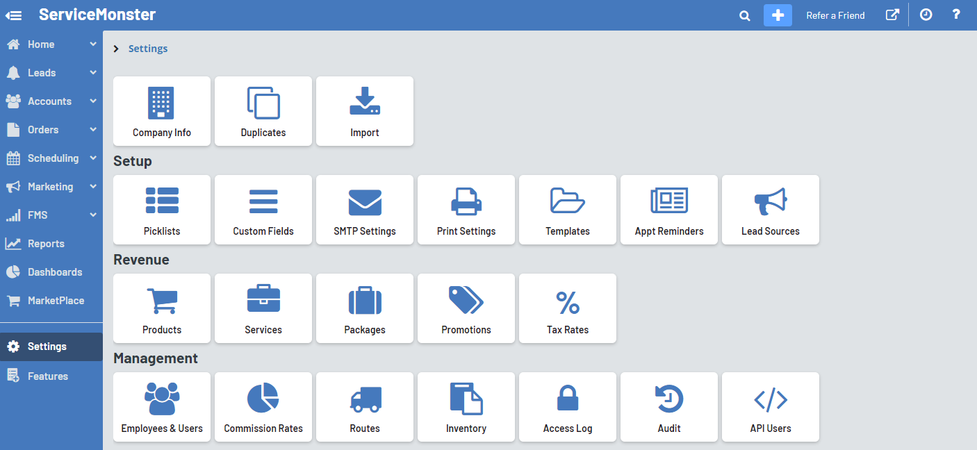 The settings page is your hub for adjusting your settings on ServiceMonster.