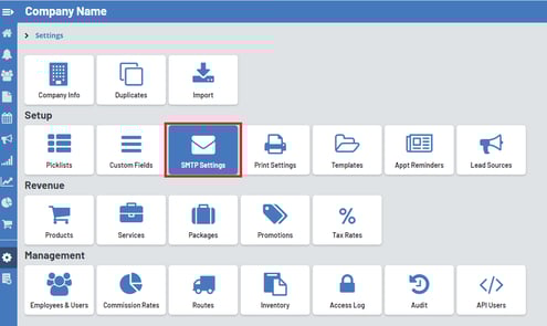 From the Main Menu, click on the "Settings" tab and choose "SMTP Settings".