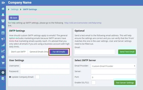 Under "SMTP Settings", select whether you want "General Emails Only" or "For All Emails".