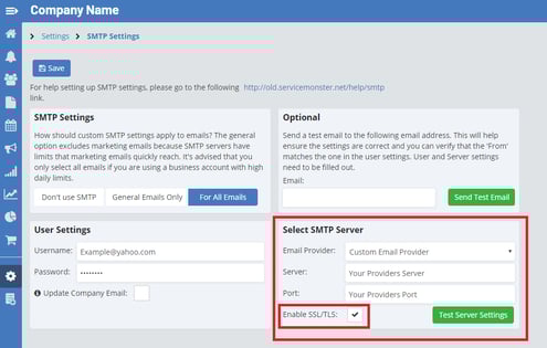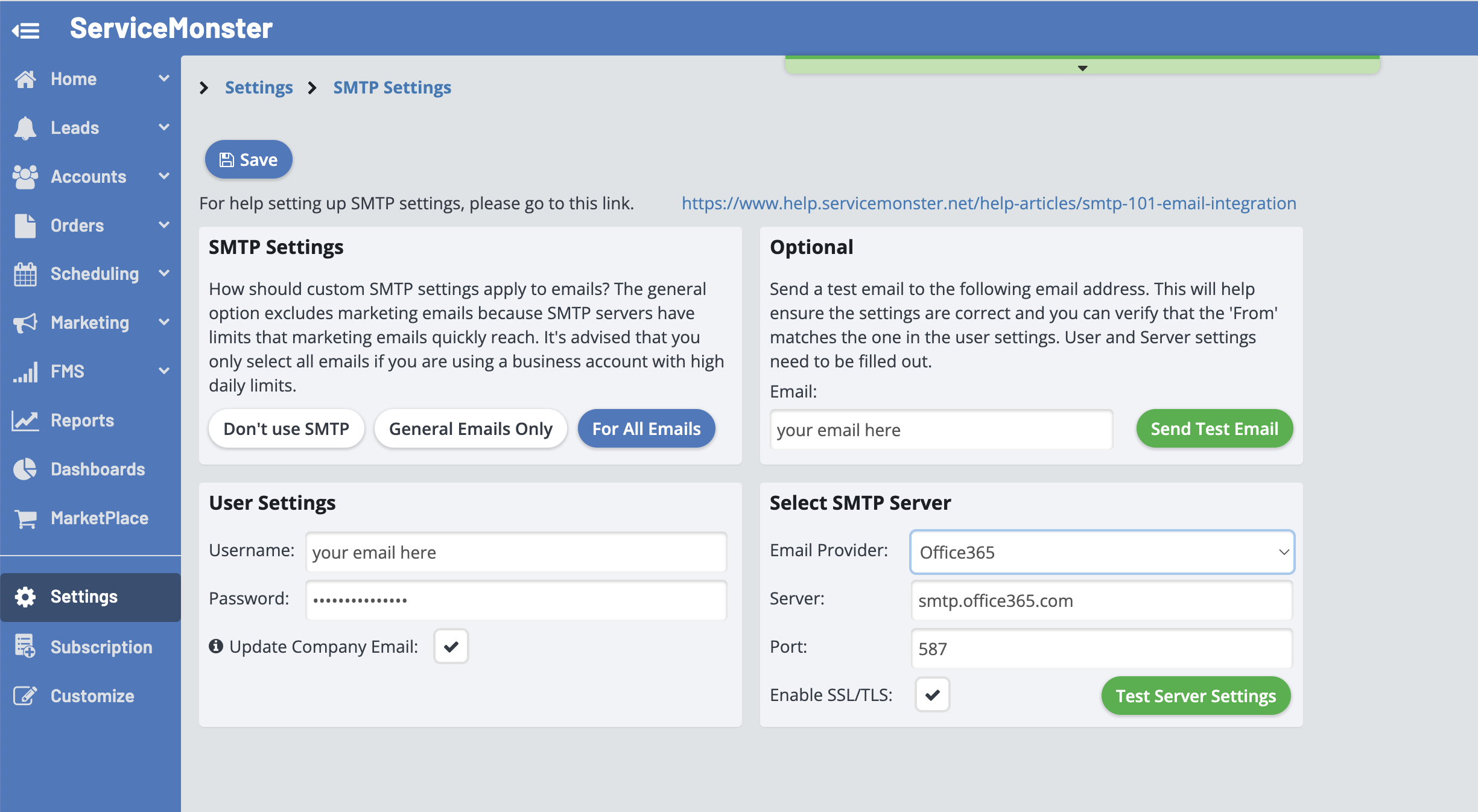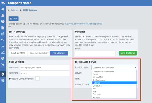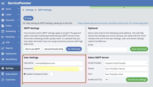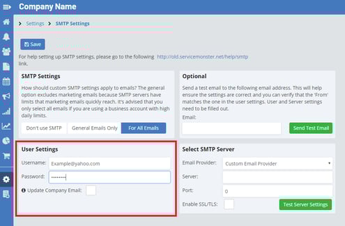 Under User Settings, fill in your Username and Password. The Username is the email you want to integrate and the password is the password to that email account. If you’d like to update the email address in your Company tab to match the one you’ve just integrated with ServiceMonster, you can check the box next to “Update Company Email”.