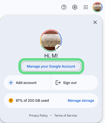 First open Gmail, and click on the icon in the top right corner of the screen. Click on "Manage Your Google Account".