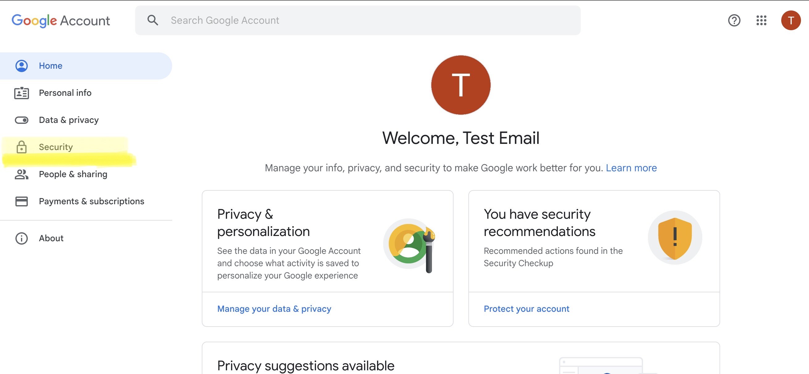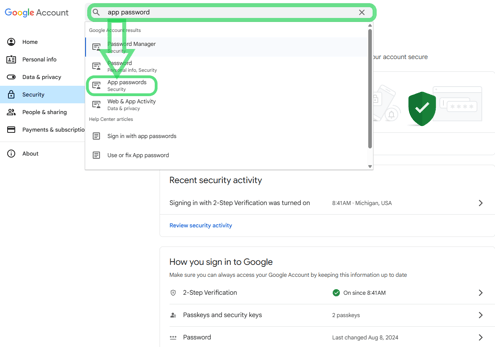 Enable your "2-Step Verification" if you haven't already. Once 2-Step Verification is enabled, then use the search bar at the top to search for "App Password" and click on the result as shown: