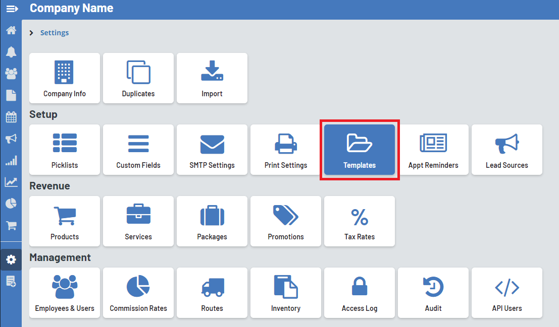 From the Main Menu, click on the "Settings" tab and choose "Templates".
