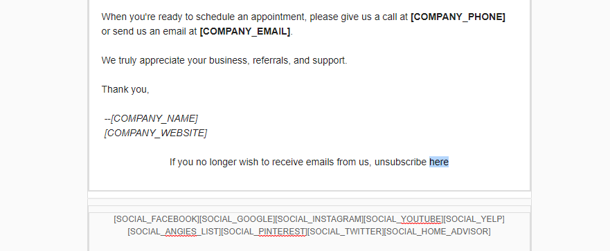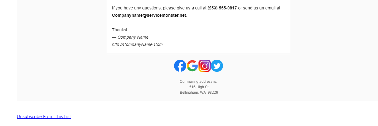 If you are using our default email settings, we will provide an unsubscribe link on every email sent through the marketing system. It will look like this example below:
