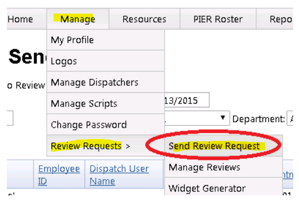 While logged into the AskTheSeal website, click on the Manage menu, then Review Requests, and finally Send Review Request.