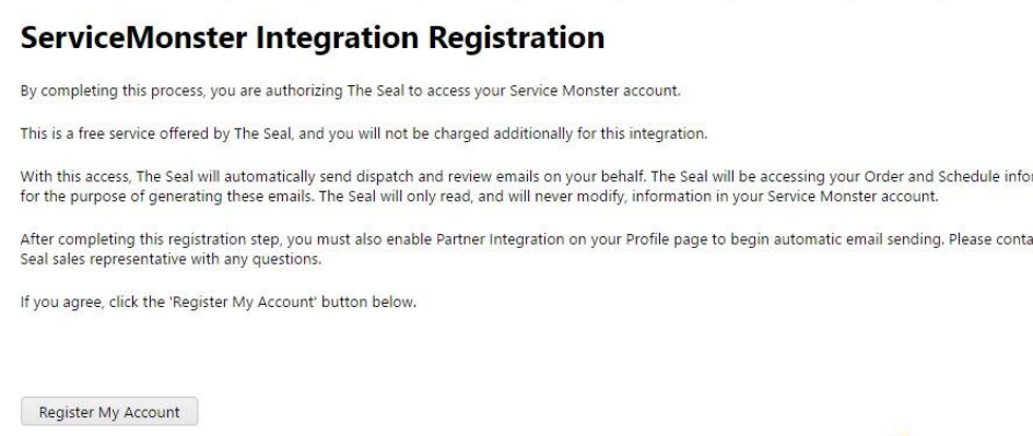 While the ServiceMonster integration is enabled by you via the ServiceMonster App Marketplace, we request that you contact your The Seal rep before you enable ServiceMonster integration, and provide an email address for integration-related information and error delivery.