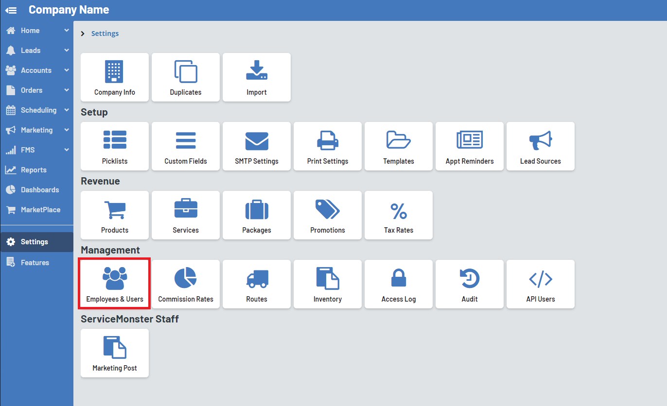 On ServiceMonster, click on Settings at the bottom of the screen, then Employees & Users