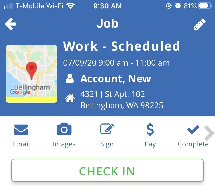 You can check in or out of jobs from the ServiceMonster mobile app. Simply click on an appointment and then on the "Check In" button.