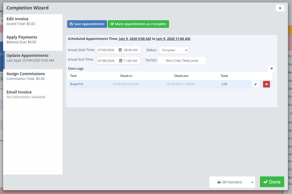 If you are using the completion wizard, you can edit time logs from the “Update Appointments” tab.
