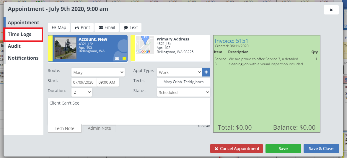 Time logs are a great tool for you to track how much time work takes to get done. This can help with accurately scheduling appointments and tracking your tech's hours.