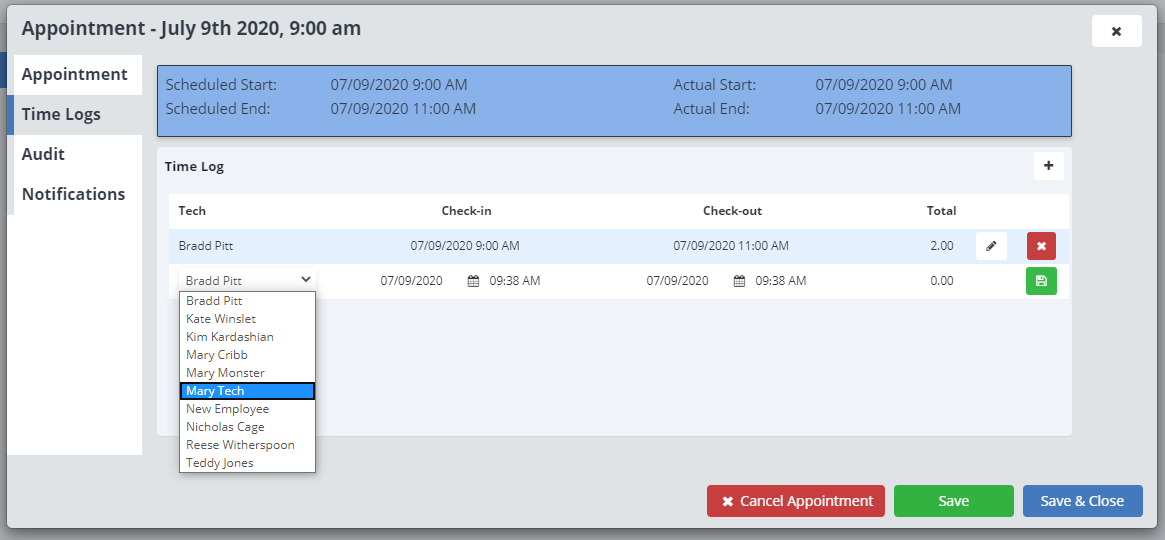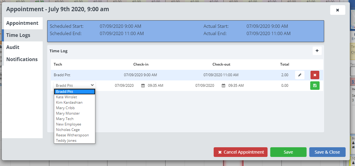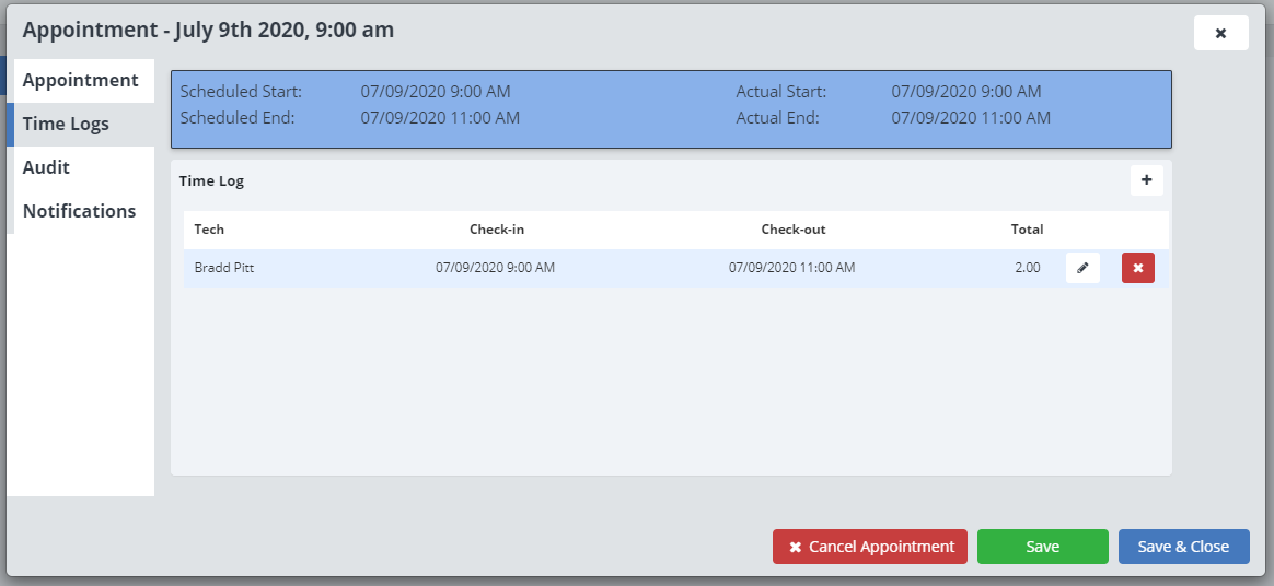 This opens up the appointment details. Click on the “Time Logs” tab to view or edit the time logs.