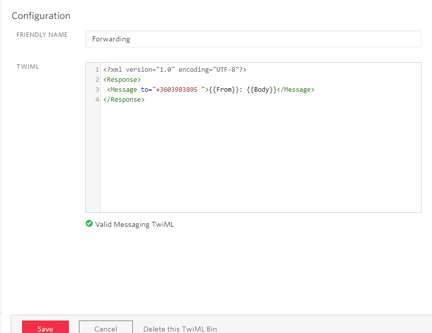 </Response>Replace the phone number with the phone number you are wanting to forward your SMS to. Include your country code and the "+"7. Click the red Create Button, select Save.