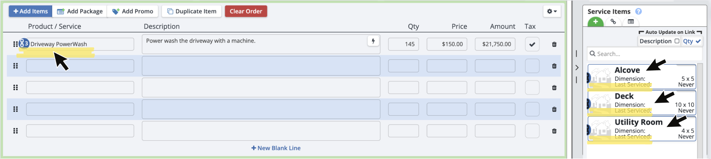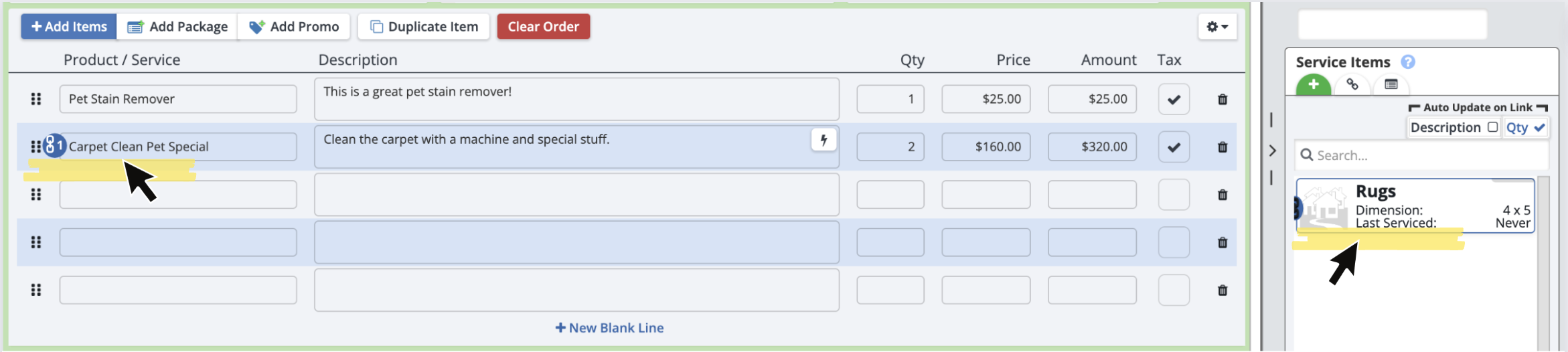 Click on the line items and Service Items to link them together. This will update the quantity and amount due.