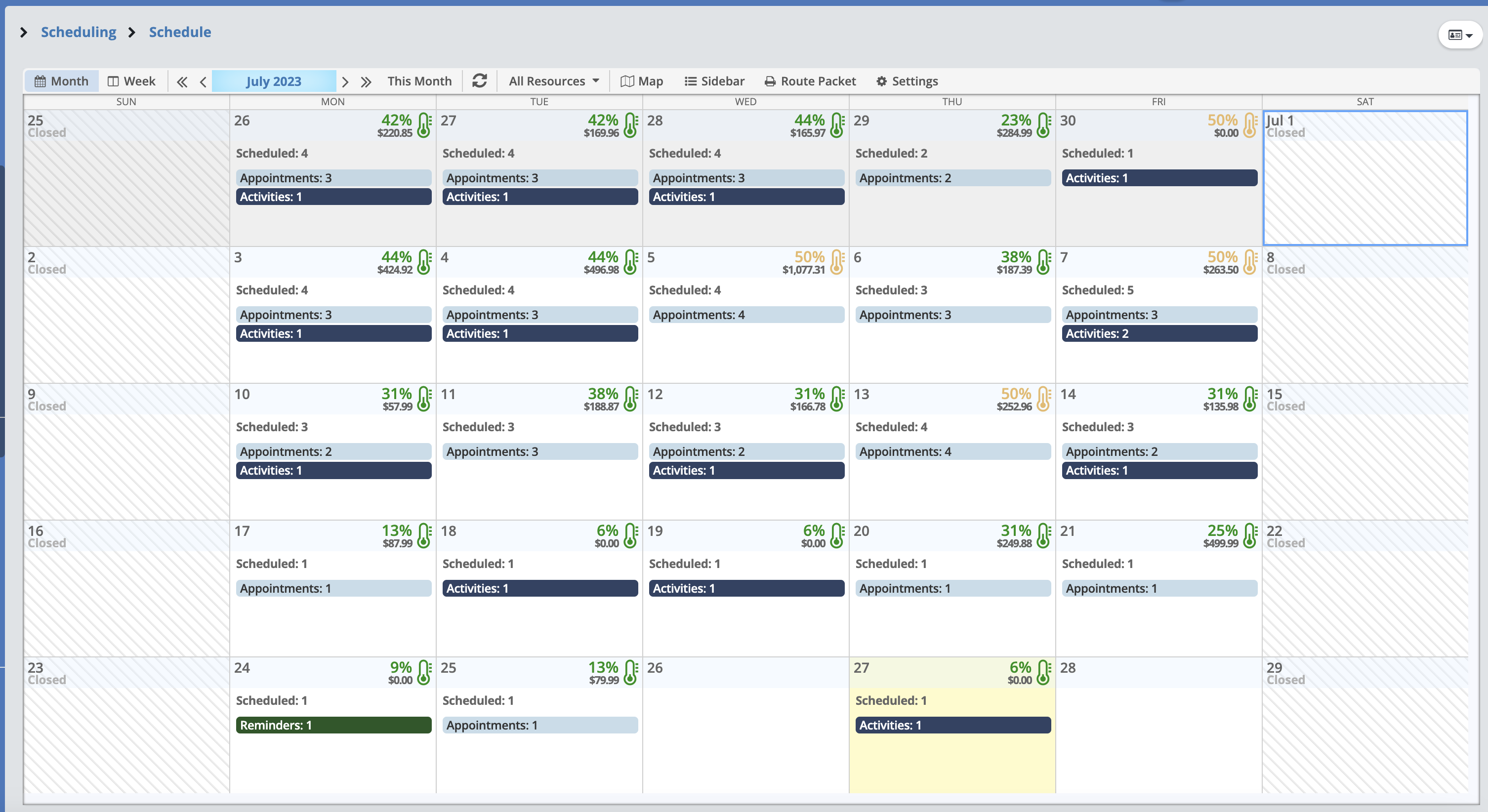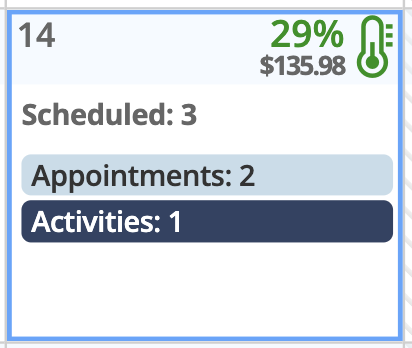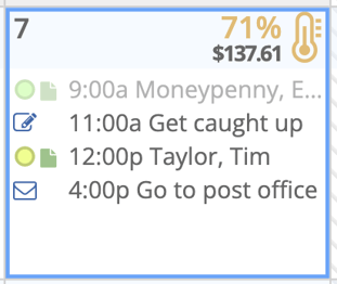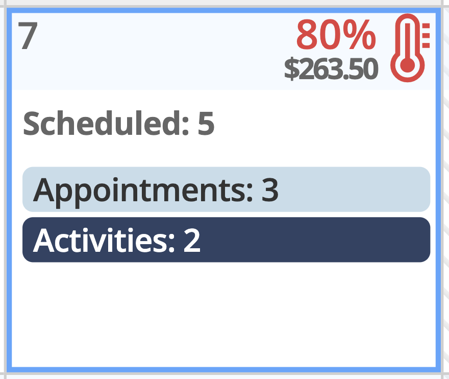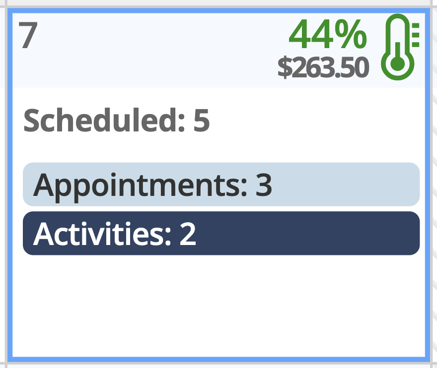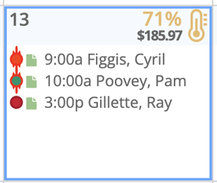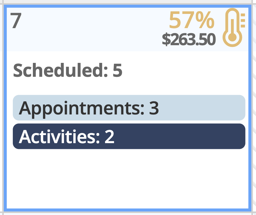 Regardless of view type, every day in the Monthly Planner has a header with a temp icon in the upper right corner, indicating how filled your day is based on the current selected resources, and below that is the revenue total for All Resources (if enabled). The temp icon appears in different colors for a quick visual reference of how full each day is.