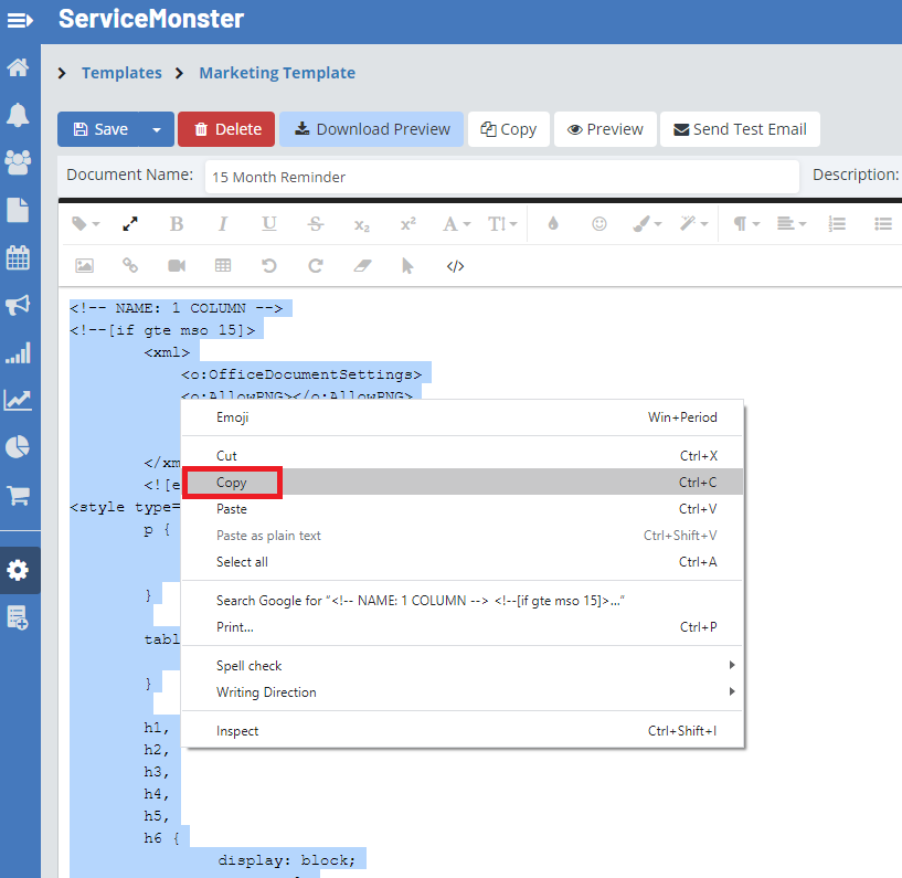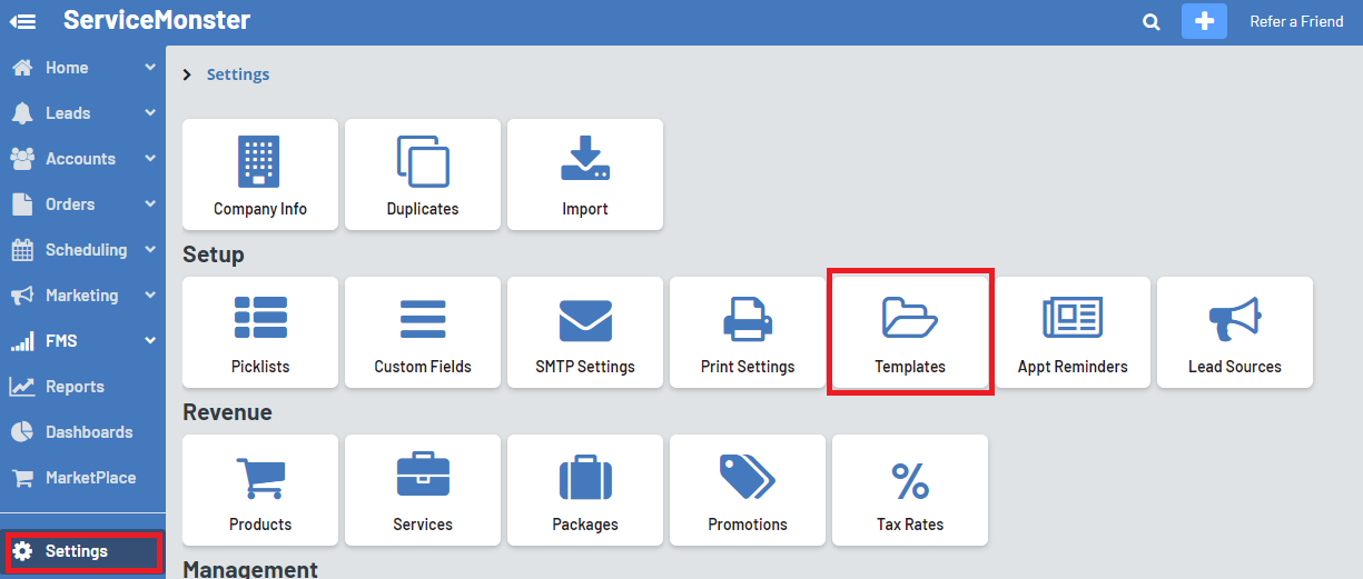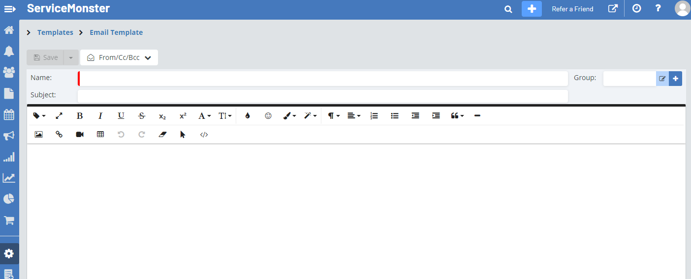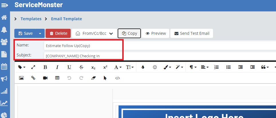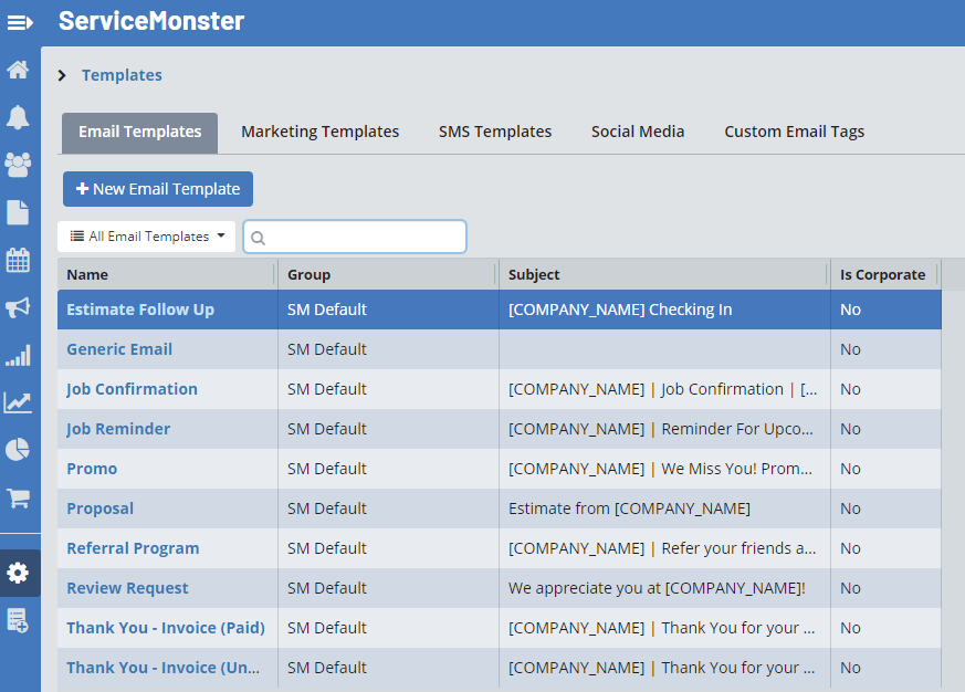 This will take you to the Email Templates page where you can view your current emails, edit them, or creating new templates. You will already have a few in your system created by ServiceMonster.