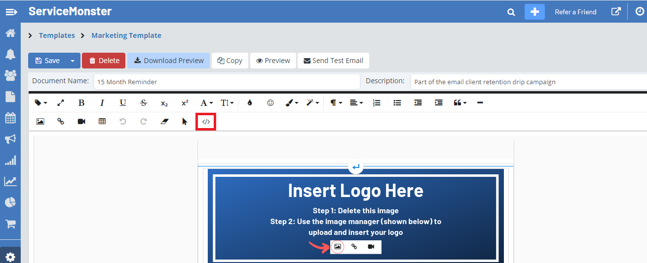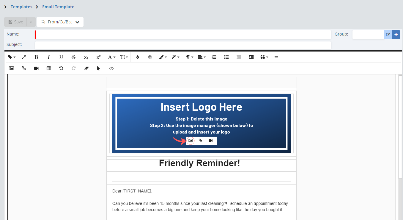 Images are a great way to customize your templates and make them truly unique to your business. They give you an opportunity to let your clients get to know you and your business. Consider adding in a team photo, an adorable pet, or before and after photos of the work you've done. Images can be added in by clicking where in the template you want the picture to go, then clicking on the "Image Manager" button on the toolbar.