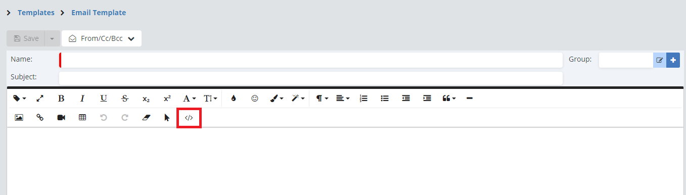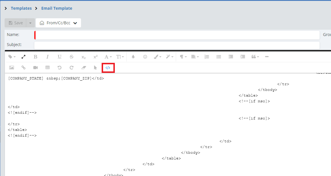 Click on the Code View button “</>”. That will let you see the HTML coding for the email.