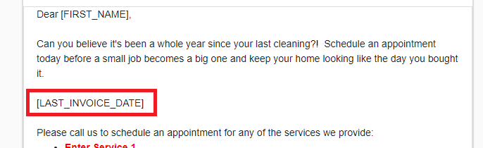 Remember to be creative with your templates. You clients could be receiving weekly emails from other businesses, how will you make yours stand out? Use images, hyperlinks, and data tags to your advantage to make a personalized and interesting email or letter for your client to receive. Make sure to include the best way for them to contact you in case they do decide it's time to get some work done!