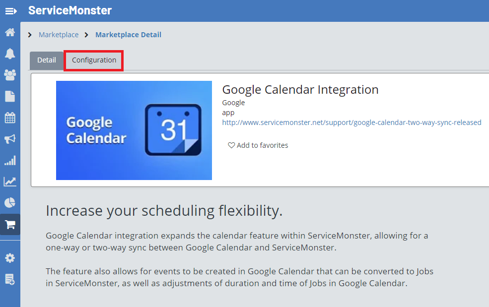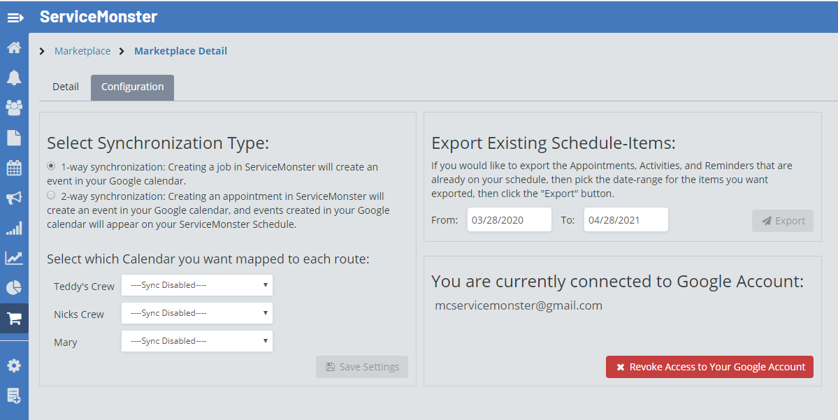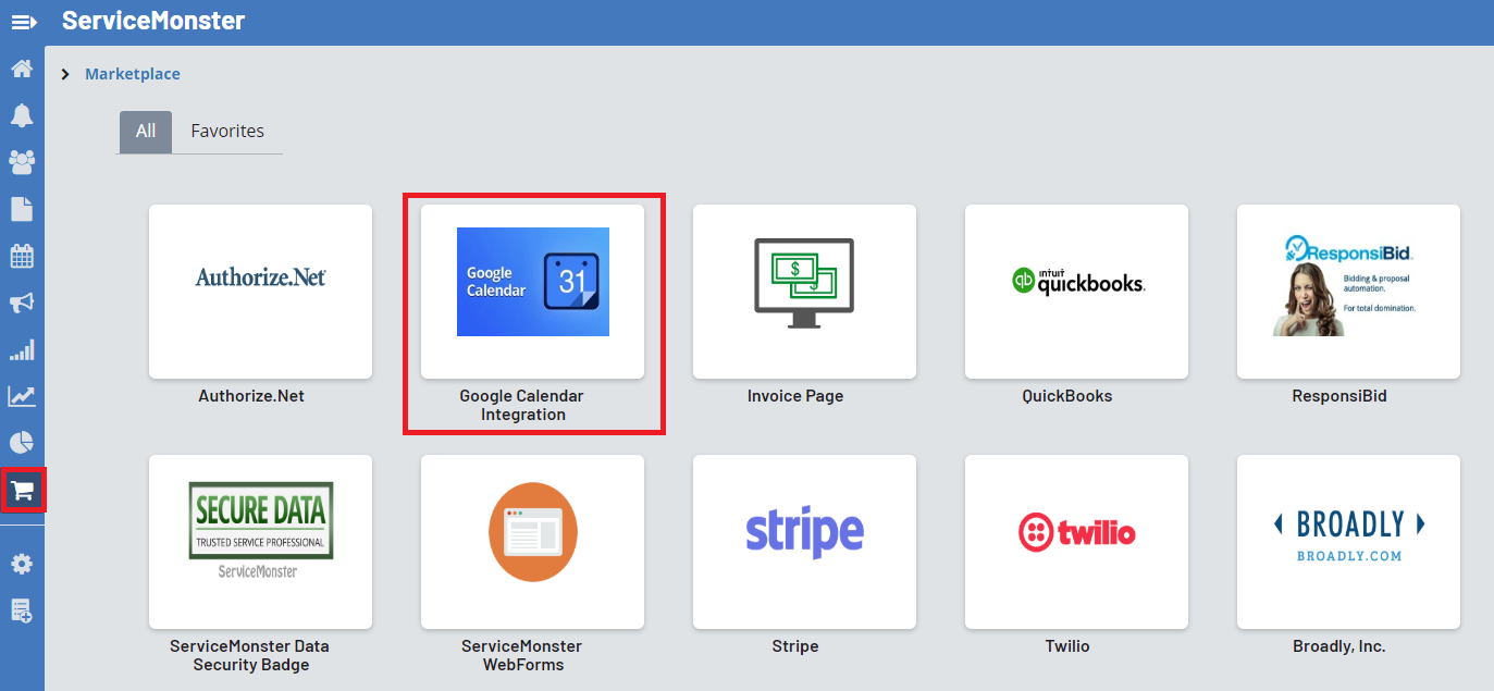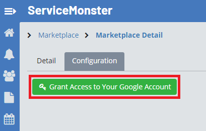 Go to your ServiceMonster account and click on Marketplace, and click on the Google Calendar Integration Icon
