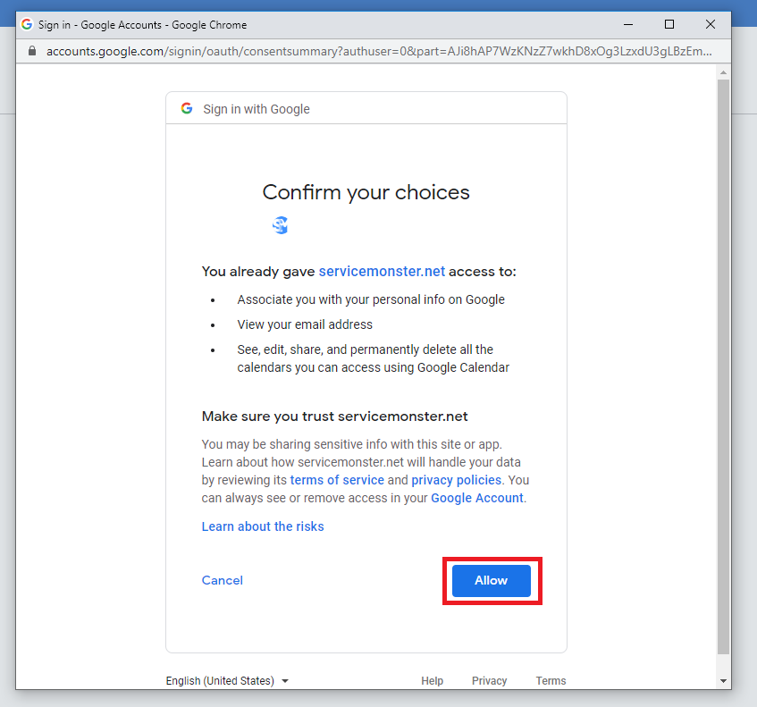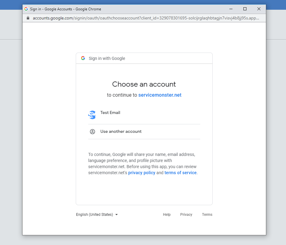 A Google Sign In pop-up will appear, choose the account that you want to be connected with Service Monster