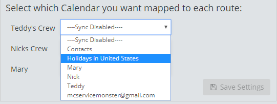 Under "Select which Calendar you want mapped to each route," choose which calendar you want in the drop downs next to your routes. We will explain how to make another calendar down below.