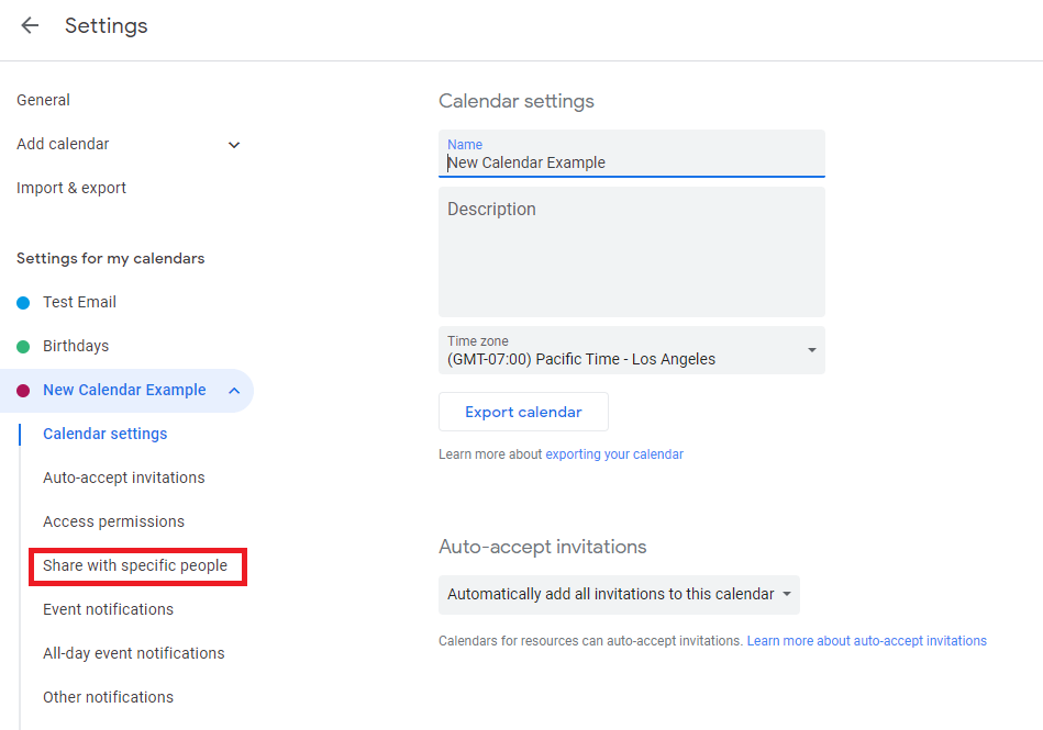 This will take you to the calendars settings, click on the "Share with specific people" link on the left hand menu.