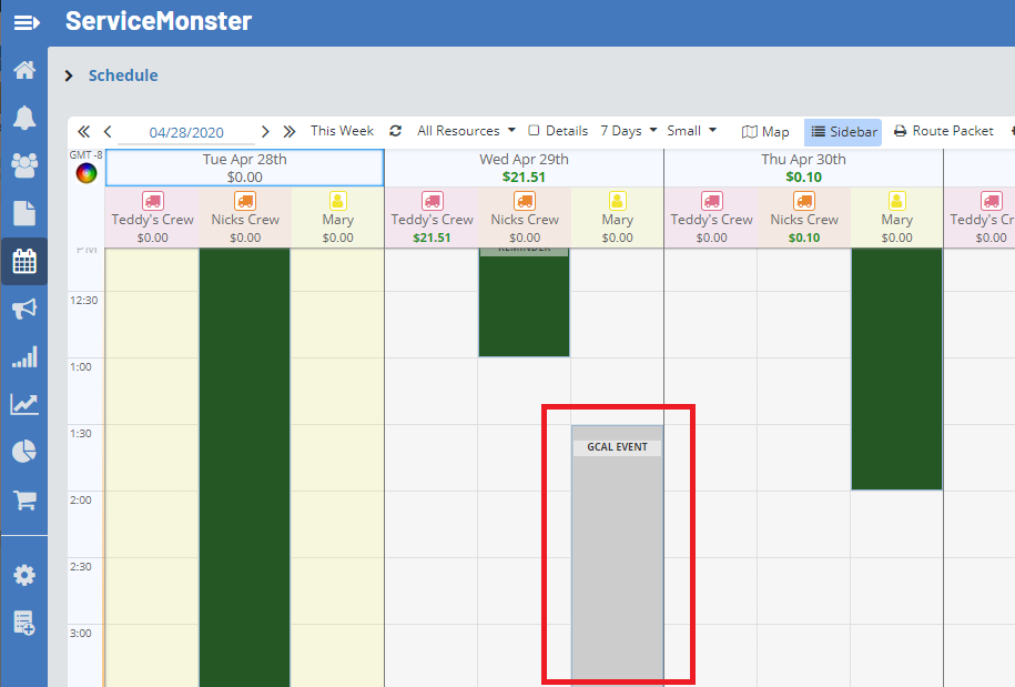 Go into your schedule on ServiceMonster. Go to the day, time, and route that you scheduled the event for. It will show up as a GCAL EVENT