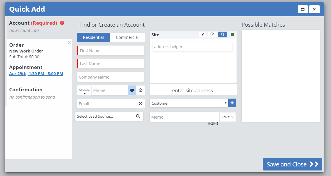Start filling out the clients details. If your client already has an account with you on ServiceMonster, then you will be able to choose them from the "PossibleMatches" box once they appear. If not, simply fill out all of the details to create a new account.