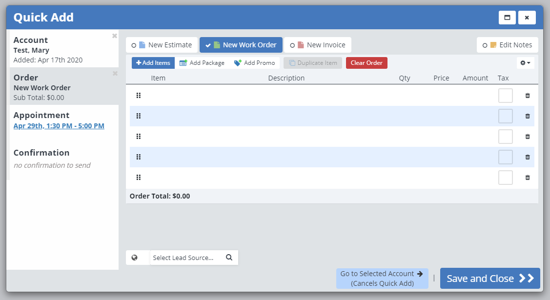 Click on the Order tab and fill out the details of the order. If there is a preexisting order you are scheduling, click on the small "x" next to the Order tab, and use the Order Lookup option to find the order.