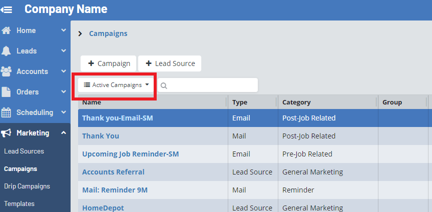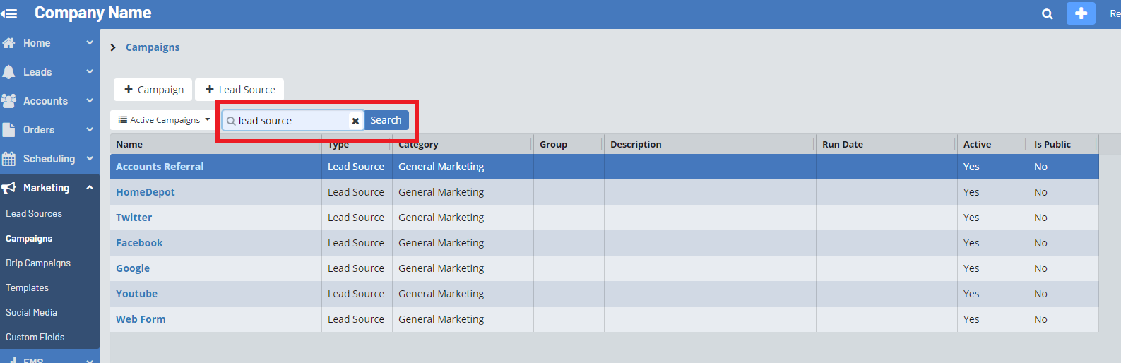 Type Lead Source in Search Bar (or type desired lead source or campaign)